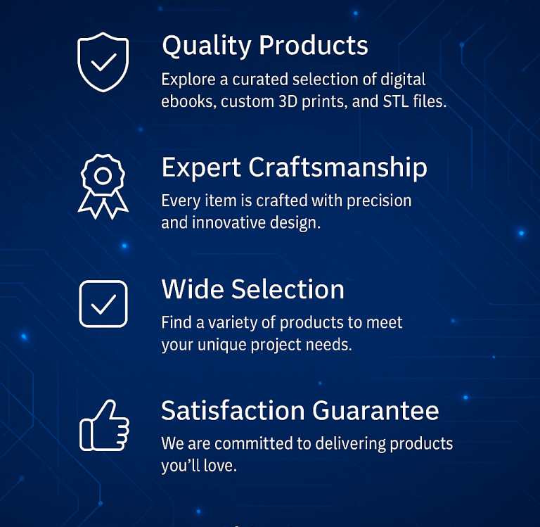 Discover premium digital ebooks, custom 3D printed products, and professional STL designs made for creators and innovators.